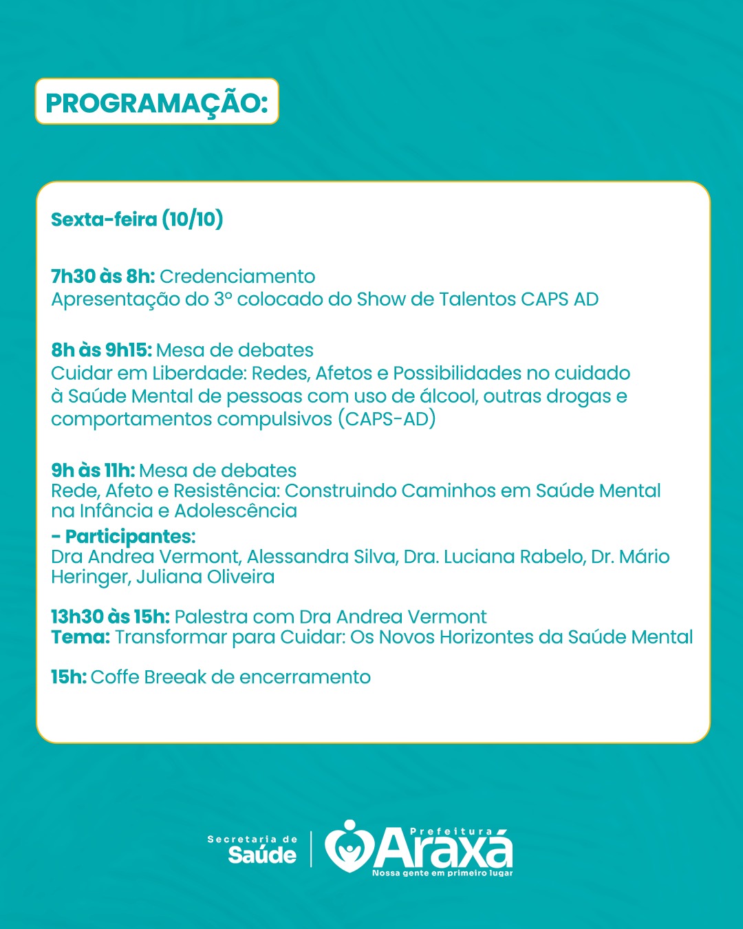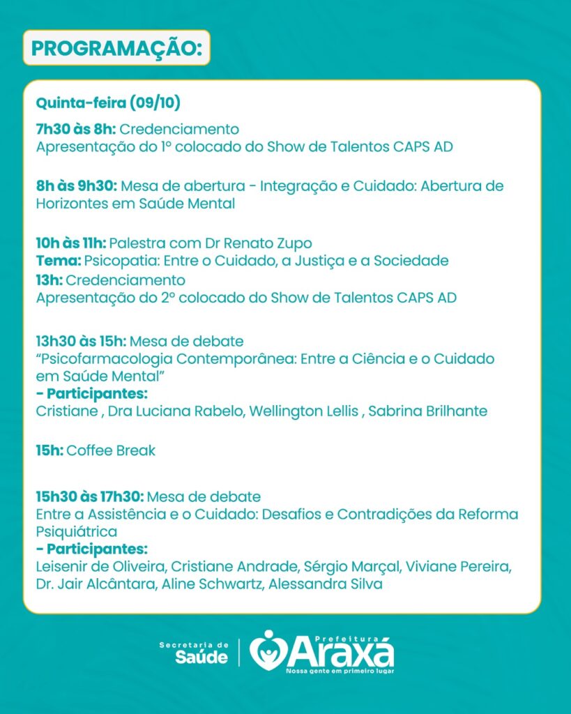 A Prefeitura de Araxá, por meio da Secretaria Municipal de Saúde, promove nos dias 09 e 10 de outubro de 2025 o II Simpósio de Saúde Mental, no Gran Hall. O evento reúne profissionais da área, acadêmicos, estudantes, instituições públicas, privadas e a comunidade, com o objetivo de fortalecer o debate sobre práticas e desafios contemporâneos em saúde mental.