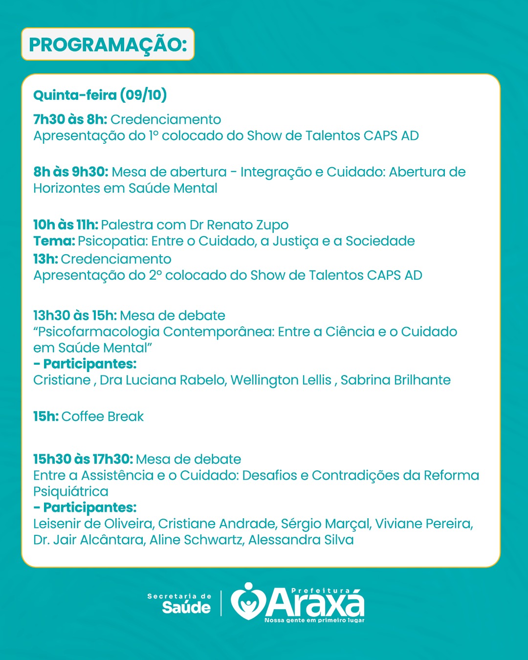 Este será um evento regional, com participação de representantes da área de saúde mental de diversas cidades, como Uberaba, Uberlândia, Ibiá, Sacramento e Iturama, além da presença confirmada de representante do Ministério da Saúde.