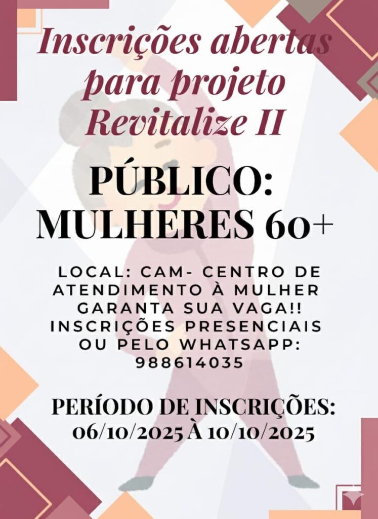 O projeto Revitalize 60+, promovido pelo Centro de Atendimento à Mulher da Fundação de Assistência à Mulher Araxaense (FAMA), está com novas inscrições abertas para sua mais recente edição. A iniciativa, que já transformou a vida de centenas de idosas em Araxá, retorna em sua segunda fase com uma proposta ainda mais completa de cuidados integrais para mulheres a partir dos 60 anos.