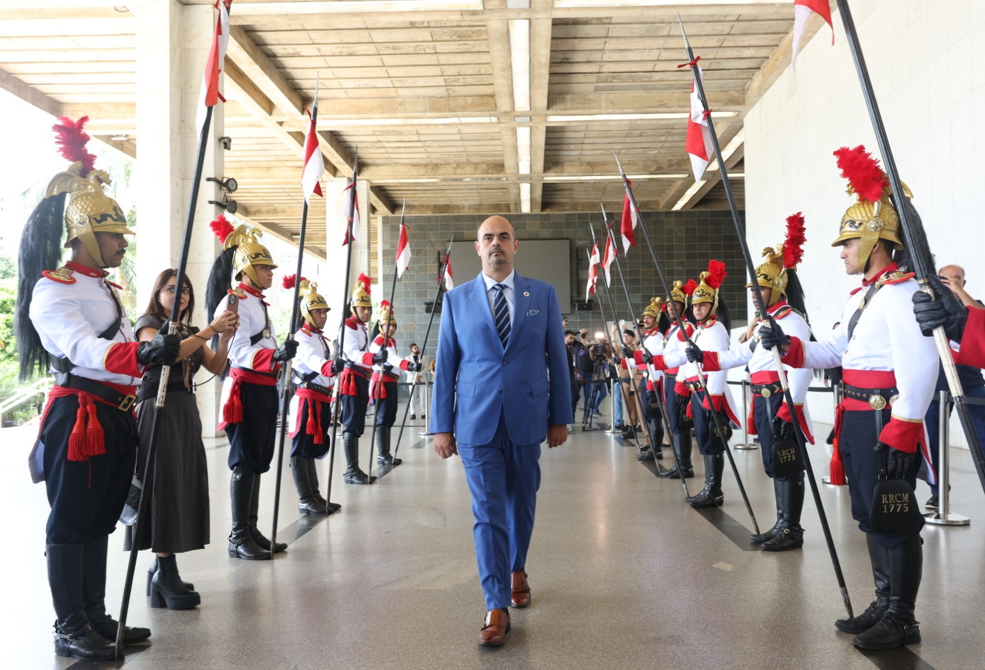 O novo governador de Minas foi recebido na ALMG por uma comitiva de deputados estaduais na porta do Salão Nobre, após atravessar o Hall das Bandeiras e passar por um corredor formado pelos Dragões da Inconfidência – grupamento de honra da Polícia Militar de Minas Gerais (PMMG).