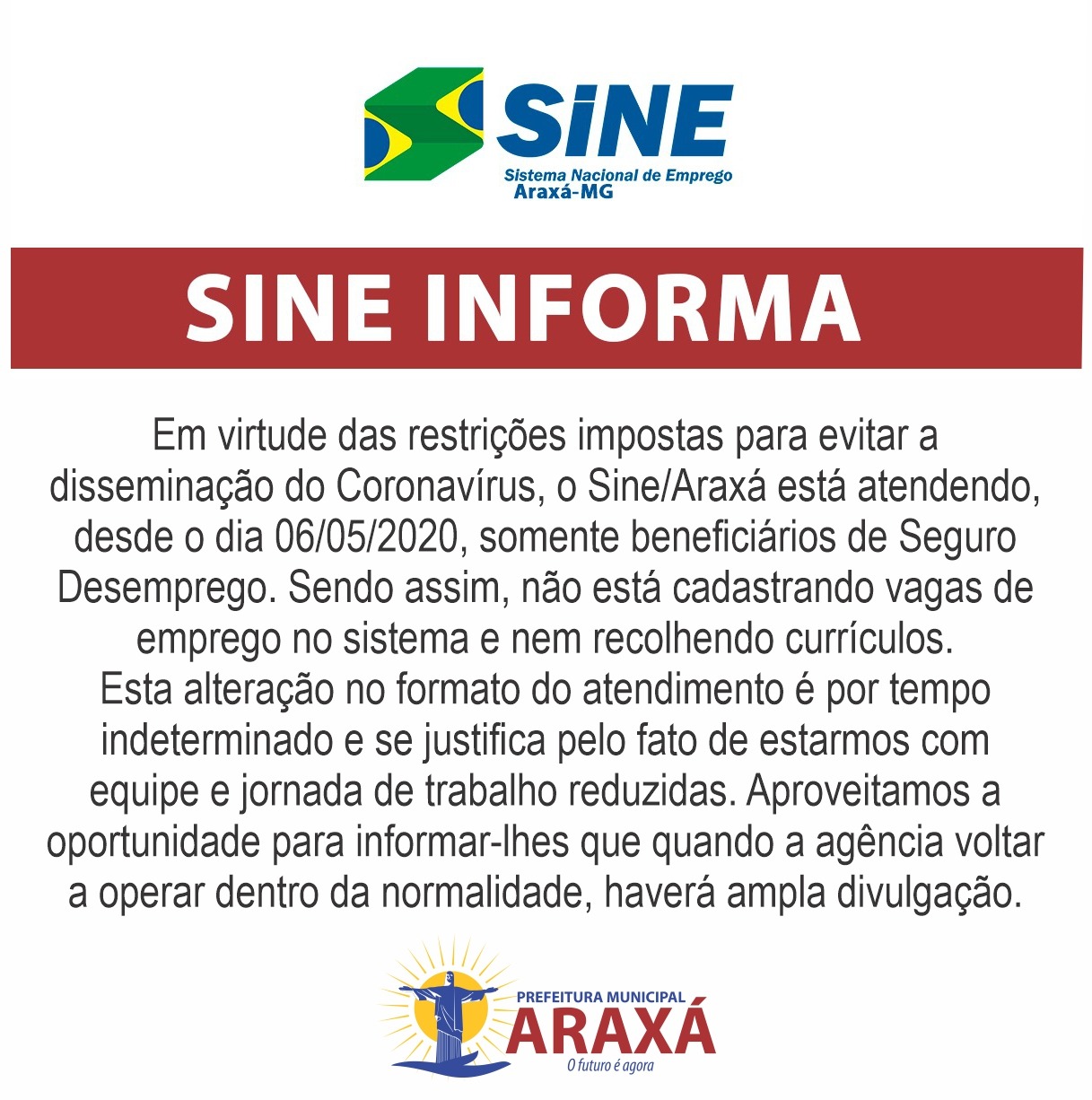 Sine está atendendo somente beneficiários do Seguro Desemprego Portal Araxá 20/05/2020 Itens relacionados Araxáseguro desempregoSine Cidade Portal Araxá 20/05/2020 Araxáseguro desempregoSine